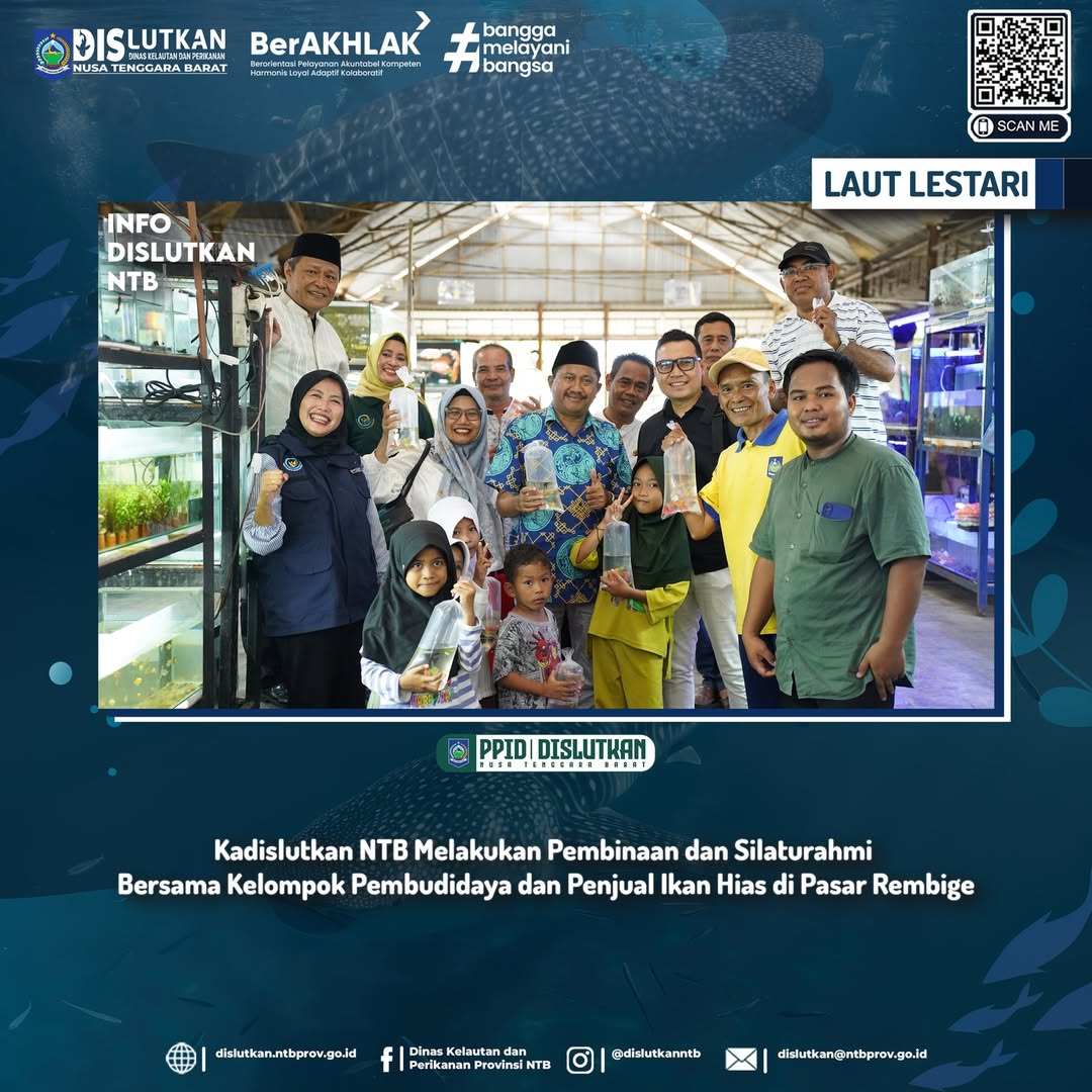 Mataram, 9 Mei 2025. Pemerintah Daerah Provinsi Nusa Tenggara Barat melalui Dinas Perikanan dan Kelautan NTB, melakukan kegiatan pembinaan dan silaturahmi kelompok bersama pembudidaya serta penjual ikan hias di Pasar Rembige, Kota Mataram. Kegiatan tersebut dihadiri oleh wakil pemprov ntb yaitu Muslim Kadis Kelautan dan Perikanan yang bertujuan untuk memperkuat hubungan sinergis antara pemerintah daerah dan pelaku usaha ikan hias, serta memberikan motovasi terkait usaha ikan hias yang lebih berkelanjutan. Pada kesempatan tersebut. Pemerintah Provinsi NTB Melalui Dinas Perikanan dan Kelautan mengakomodir Beberapa usulan masyarakat terkait ketersediaan stok ikan hias, sarana pendukung kegiatan penampungan dan pemasaran ikan seperti genset dan perlengkapan aerasi, serta kemudahan dalam pengiriman ikan hias ke luar daerah dengan dukungan Balai Karantina.